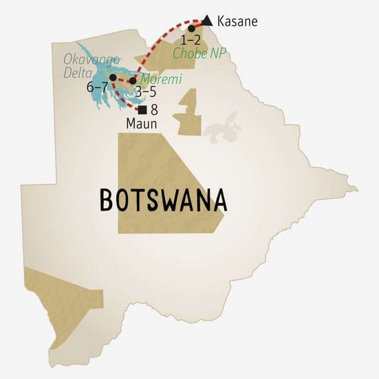 1. TAG: Kasane–Chobe Nationalpark. Individuelle Anreise nach Kasane, wo Sie abgeholt werden. Es folgt ein ca. stündiger Transfer in Ihre Unterkunft, die sich im Nationalpark befindet. Der Chobe Fluss ist die Lebensader des Parks und bietet ausgezeichnete Tierbeobachtungen. Am Nachmittag unternehmen Sie eine erste spannende Pirschfahrt. Übernachtung Chobe Game Lodge o. ä. (MA)