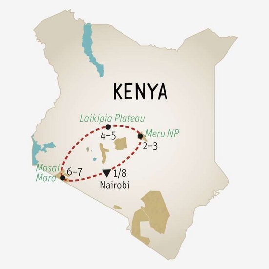 Kleingruppe bis 8 Personen – garantiert ab 2 Personen – Englisch. Erleben Sie: Kenya aus der Luft, Suche nach den nur in der nördlichen Hemisphäre vorkommenden «Northern Five» im Meru Nationalpark und im Loisaba Wildschutzgebiet sowie die eindrückliche und vielfältige Tierwelt in der berühmten Masai Mara.