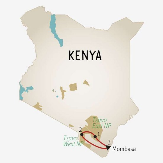 3. TAG: Tsavo Nationalpark West–Mombasa. Heute früh steht eine geführte Buschwanderung auf dem Programm. Nach der Rückkehr ins Camp, wo Ihnen das Frühstück serviert wird, verlassen Sie den Park und fahren zurück an die Küste. (FM)