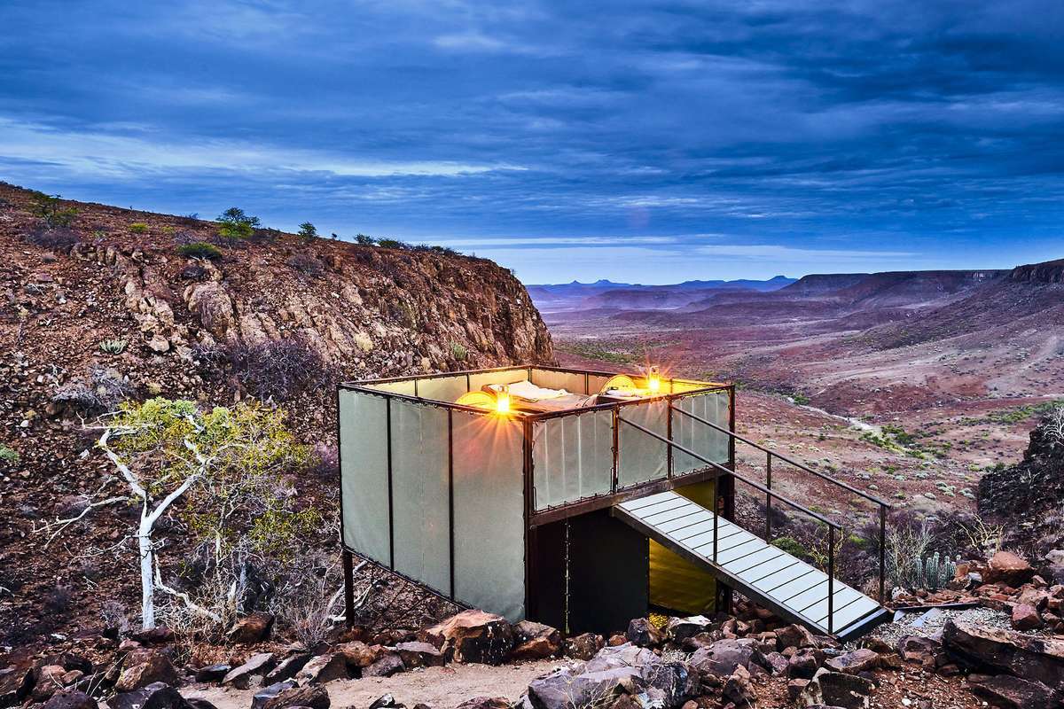 1. TAG: Etendeka Berge. (± 6 km/3 Std.). Individuelle Anreise in die Palmwag Lodge. Hier parken Sie Ihr Auto und um 16.00 Uhr treffen auf Ihre Reisegruppe und den Reiseleiter. Sorgfältig gibt er Ihnen Tipps und Tricks und erklärt Ihnen was Sie die nächsten Tage erwarten wird. Ihr Gepäck wird bereits in Ihr Camp gefahren, Sie müssen nur Ihren Tagesrucksack mitnehmen. Die erste Wanderung bietet spektakuläre Ausblicke über unberührte Felsformationen. Ihr erstes Camp liegt an einem ausgetrockneten Flussbett. Sie übernachten in komfortablen Betten auf einer der fünf erhöhten Plattformen. Am Tag bietet ein Dach Schatten, in der Nacht wird das Sonnendach entfernt, somit haben Sie den Blick frei und können das afrikanische Sternenzelt in vollen Zügen geniessen. Die Plattform ist mit einer Toilette und einem Lavabo ausgestattet. Eine Buschdusche teilen sich je zwei Zelte. Das Abendessen wird vom Personal über dem Feuer zubereitet. Übernachtung Fly-Camp (A)