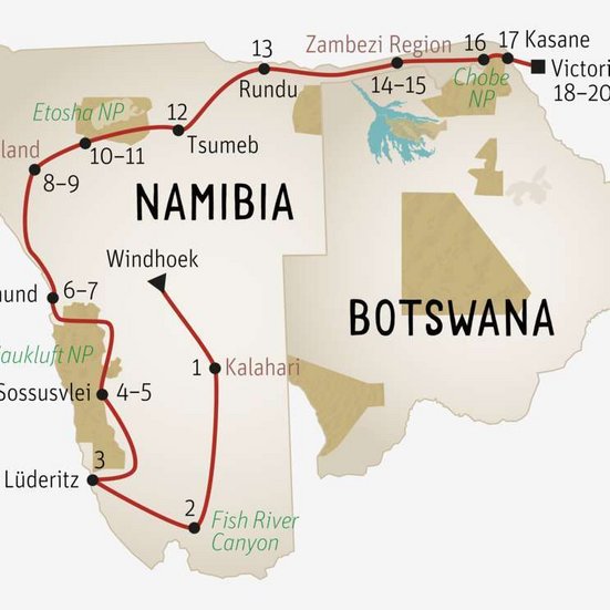 Geführte Rundreise – max. 16 Personen – garantiert ab 2 Personen – Englisch/Deutsch – internationale Kundschaft. Erleben Sie: den zweitgrössten Canyon der Welt, die höchsten Dünen der Welt, Küstenstädtchen Swakopmund, szenenreiche Landschaften, Tierbeobachtungen und den fruchtbaren Caprivi Streifen.