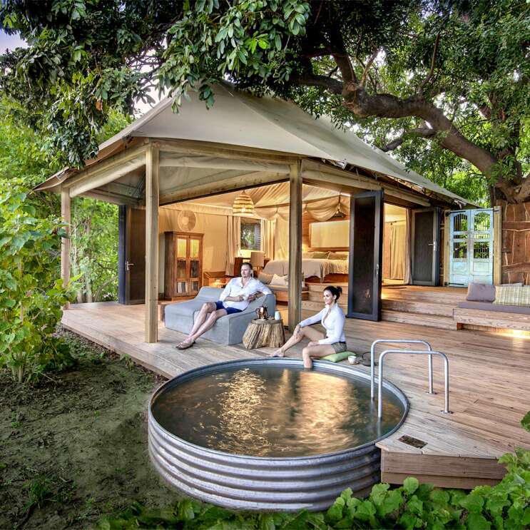Der Hauptbereich liegt direkt am Rande des Flussufers und bietet eine offene "Boma" (Feuerstelle), Infinity-Pool und eine kleine Bibliothek (WLAN). Zur Entspannung stehen darüber hinaus ein Fitnessraum und ein Spa-Bereich zur Verfügung. Verbringen Sie den Abend mit einem erfrischenden Sundowner-Drink, während Sie den herrlichen afrikanischen Sonnenuntergang beobachten, und tauschen Sie am Feuer in der gemütlichen Boma Geschichten über Ihre Safari aus, bevor Sie ein afrikanisch inspiriertes Feinschmeckermenü geniessen.