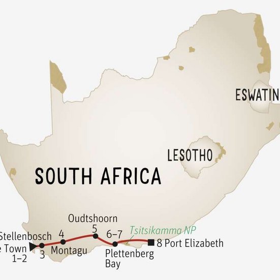 6. TAG: Oudtshoorn–Plettenberg Bay. (± 160 km). Über den Outeniqua Pass geht es in Richtung Küste. Lassen Sie sich von den kilometerlangen Sandstränden verzaubern. Übernachtung Bronze Periwinkle Lodge o. ä. (F) Silver The Plettenberg o. ä. (F) Gold Tsala Treetop Lodge o. ä. (F)