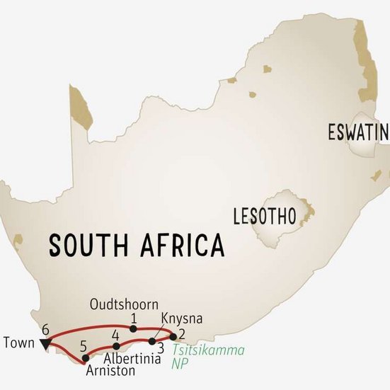 2. TAG: Oudtshoorn–Tsitsikamma. (± 295 km). Nach einem gemütlichen Frühstück im Hotel besuchen Sie heute Morgen die faszinierenden Cango Caves. Die Reise führt Sie weiter via Prince Alfred’s Pass bis nach Tsitsikamma. Übernachtung Bronze Tsitsikamma Village Inn o. ä. (FA) Silver Knysna Hollow o. ä. (FA) Gold Kanonkop House o. ä. (FA)