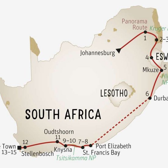 Mietwagenrundreise – Auf eigene Faust durchs Land der Regenbogennation. Erleben Sie: Tierbeobachtungen im Krüger Nationalpark und im Hluhluwe Nationalpark, einsame Strandabschnitte, steile Klippen und verträumte Lagunen, Vogel Strauss, Weinkünste und die wohl schönste Stadt der Welt, Kapstadt!