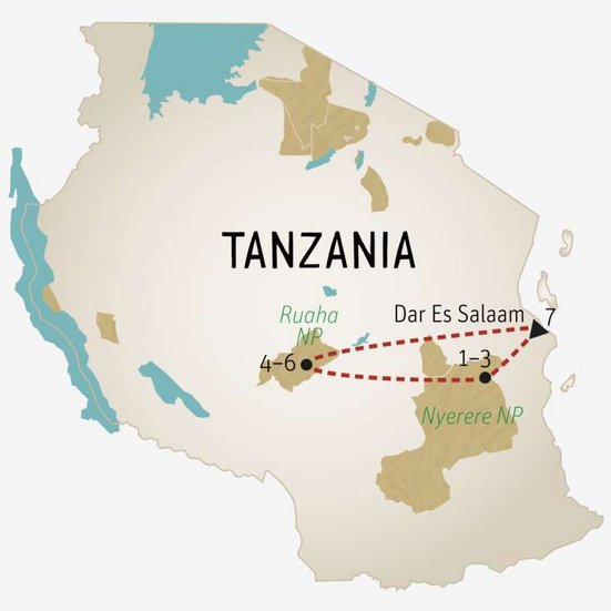 1. TAG: Dar es Salaam–Nyerere Nationalpark. Sie verlassen die Grossstadt am Vormittag und fliegen im Kleinflugzeug in den grössten Nationalpark Afrika’s. Der Nyerere Nationalpark gehört zum UNESCO Weltnaturerbe und nur der nördlichste Teil des riesigen Gebiets ist für Fotosafaris und den Ökotourismus geöffnet. Am Nachmittag nehmen Sie an einer ersten Pirschfahrt teil. Übernachtung Bronze Africa Safari Nyerere Camp o. ä. (MA) Silver Siwandu o. ä. (MA) Gold Roho Ya Selous o. ä. (MA)