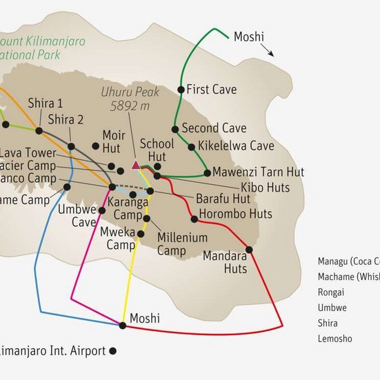 Die gängigsten Routen sind die Marangu und die Machame Route, sie sind auch bekannt unter den Namen Coca Cola und Whiskey Route. Jedes Trekking hat seine einzigartigen Höhepunkte und Eigenschaften. Bei jeder Route kann ein Akklimatisierungstag hinzugefügt werden und die erste und letzte Nacht wird jeweils im Basishotel verbracht.