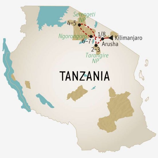 8. TAG: Ngorongoro Schutzgebiet–Arusha. Am Vormittag fliegen Sie zurück nach Arusha. Dort angekommen werden Sie zur Arusha Coffee Lodge transferiert, wo ein Tageszimmer für Sie reserviert ist. (FM)