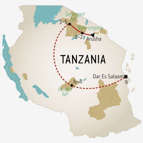 9. TAG: Ruaha Nationalpark–Dar es Salaam. Nach dem Frühstück verlassen Sie diese abgeschiedene Gegend und fliegen zurück nach Dar es Salaam. Eine Verlängerung in einem der Badeferienhotels auf Zanzibar, Pemba oder Mafia bietet sich an. (F)