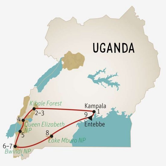 Kleingruppe bis max. 6 Personen – garantiert ab 2 Personen – Englisch. Erleben Sie: die kreischenden Schimpansen im Kibale Forest, die schöne Landschaft und eine Bootsfahrt auf dem Kazinga Kanal im Queen Elizabeth Nationalparks und die unvergessliche Begegnung mit dem Silberrücken und seiner Familie im Bwindi Nationalpark.