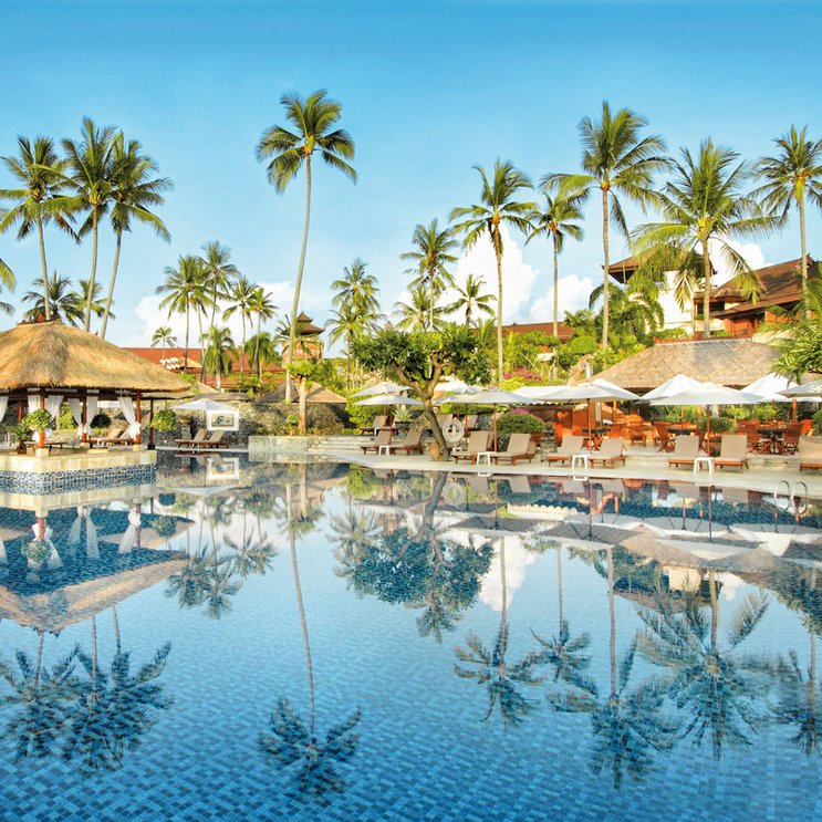 Das weitläufige 5-Sterne Resort mit tropischem Garten befindet sich in direkter Strandlage. An einen balinesischen Palast erinnernd, verwundert es nicht, dass sich hier schon hohe Würdenträger, Königinnen und Könige, Staatsoberhäupter und Präsidenten wohlfühlten und sich verwöhnen ließen.