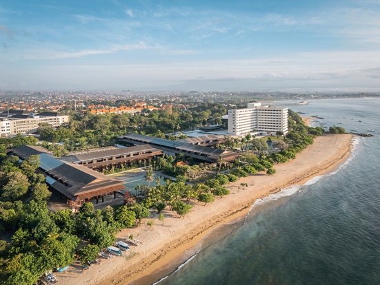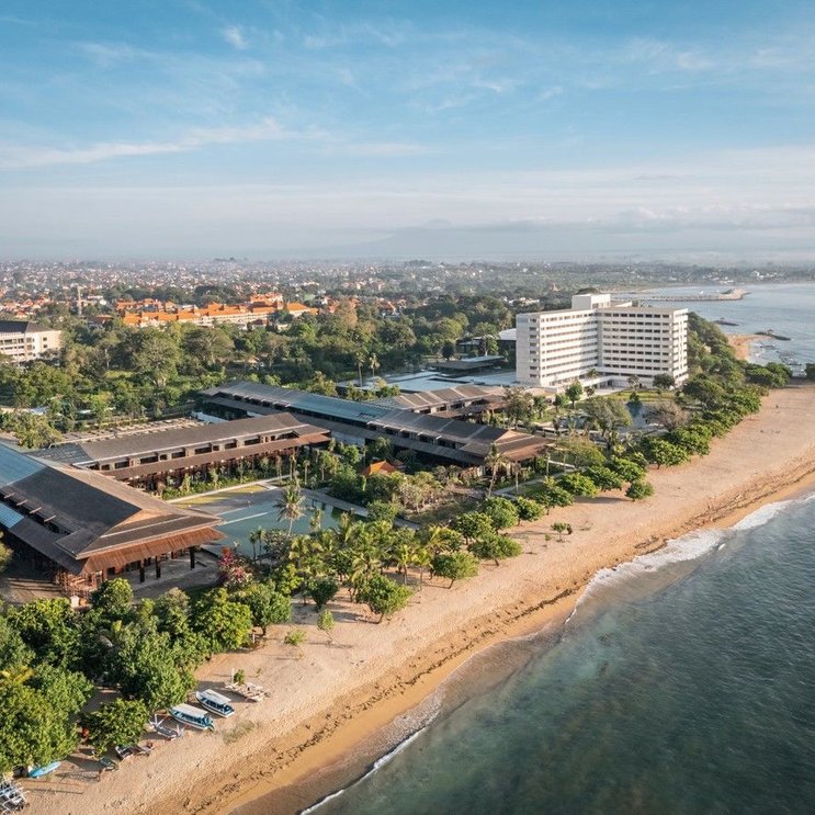 Urlaubsglück am weißen Sanur Beach: ein Pool mit Strandblick, ein tropischer Garten, mehrere Restaurants, dazu ganzheitliche Wellness, Fitnesszentrum, Kids Club und mehr. Nebenan erweitert das Bali Beach Hotel das Angebot.