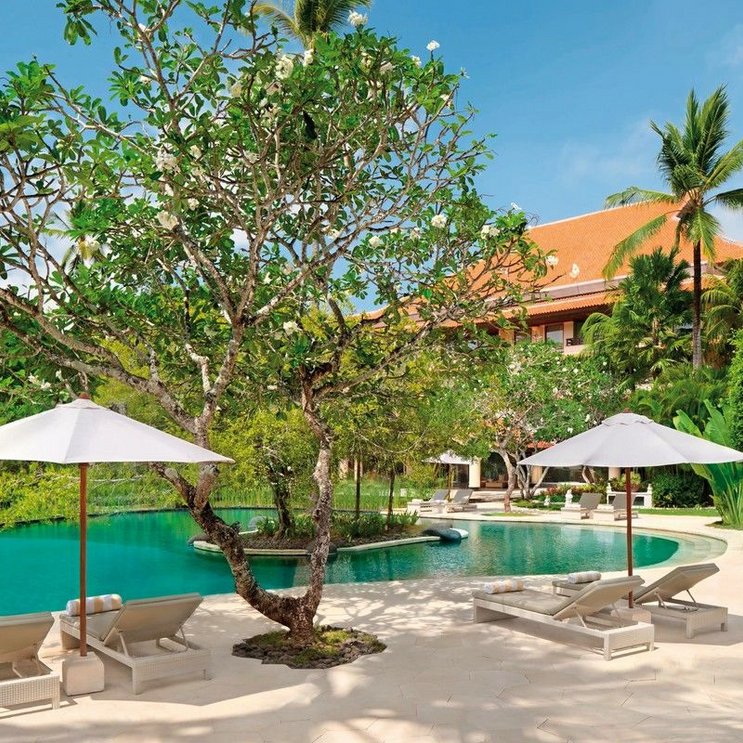 Entfliehen Sie dem Alltag und entspannen Sie am weißen Sandstrand von Nusa Dua. Im bezaubernden Hotelgarten spenden Ihnen Kokospalmen Schatten.