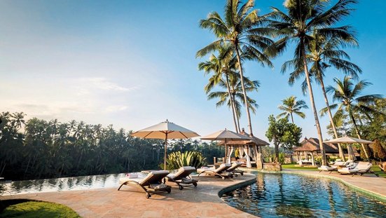 Das Hotel: Das exklusive Boutique-Resort liegt in der Nähe des Künstlerorts Ubud auf einem Hügel und bietet spektakuläre Ausblicke auf das Tal des Wildwasserflusses Petanu River und persönlichen Service auf höchstem Niveau. Zu den Annehmlichkeiten des Resorts zählen die zwei mehrfach ausgezeichneten Restaurants, Bar, Swimmingpool, Bibliothek, Fitness-Center, Squashplatz, Boutique und Akoya Spa mit Behandlungsräumen, Dampfbad, Plunge- und Whirlpool (Anwendungen und Schönheitsbehandlungen gegen Gebühr). Der eigene Helipad macht es möglich, Ausflüge der besonderen Art direkt ab dem Resort anzubieten. Ubud ist ca. 5 Autominuten (Transfer ohne Gebühr), der Flughafen Denpasar ca. 40 km entfernt.