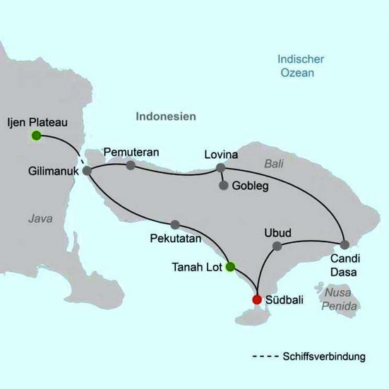 Ihre Reise geht zum Mount Ijen auf Java sowie zu vielen Highlights der Insel Bali: Der Muttertempel Besakih, ein Schnorchelausflug auf der Insel Menjangan und die ehemalige Königsstadt Klungkung erwarten Sie!