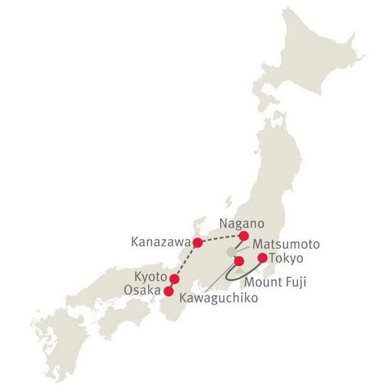 Die Kulturschätze von Kyoto zum Auftakt, die vibrierende Metropole Tokyo zum Abschluss! Dazwischen bestaunen Sie in einer Kleingruppe Japans Wahrzeichen Fuji-san, geschichtsträchtige Burgen, das Panorama der japanischen Alpen und spazieren durch kunstvoll angelegte Gärten und malerische Samurai-Viertel.
