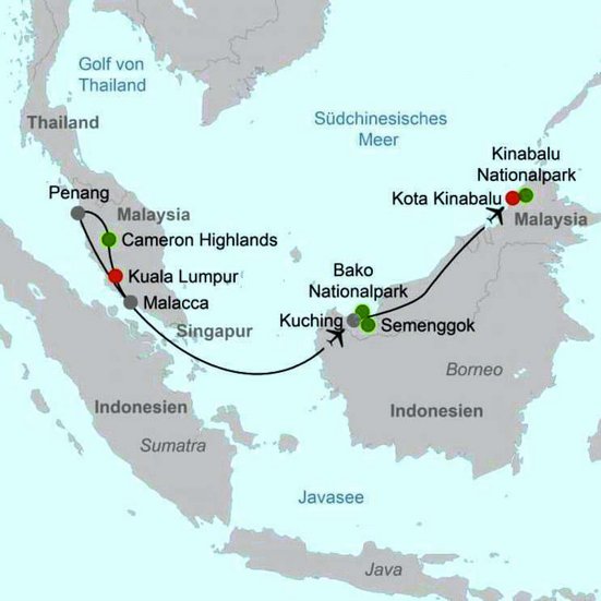Entdecken Sie ein Land, in dem unterschiedlichste Kulturen zu Hause sind. Das moderne Malaysia finden Sie im Westen des Landes, besonders im hypermodernen Kuala Lumpur. Dschungellandschaften und Naturvölker warten im ursprünglichen Borneo auf Sie.