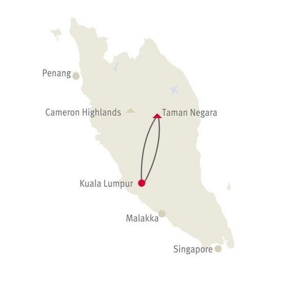 Geniessen Sie die freie Zeit bis zu Ihrem zweistündigen Bootstransfer zurück zur Anlegestelle, wo Sie bereits für Ihre Autofahrt nach Kuala Lumpur erwartet werden. Das Brummen der Stadt ersetzt nun wieder das Surren des Dschungels.