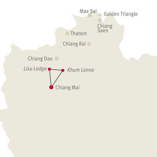 Entlang wunderschöner Landschaft geht die Fahrt im Pick-up Truck zur Lisu Lodge. Sie wandern in kleinen Etappen, meist auf Dschungelpfaden bergwärts und besuchen unterwegs verschiedene Dörfer und Bergstämme und erhalten so Einblick in deren traditionelle Lebensformen, die die Bewohner gut bewahren konnten. Zurück zur Lodge geht es mit dem Bambusfloss auf dem Mae Taeng Fluss.