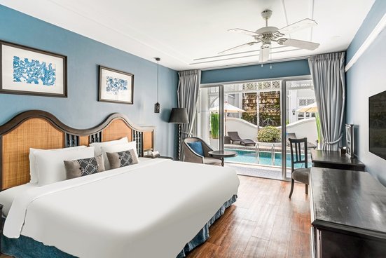 - 31-35 qm, Doppel, Deluxe, Erdgeschoss, Poolblick, Schreibtisch, Regendusche, WC, Bademantel, Haartrockner, Klimaanlage, Minibar kostenpflichtig, Safe, TV (Sat-TV), WLAN, Kaffee/Tee, Terrasse (möbliert), direkter Poolzugang, hochwertige Badartikel, Anzahl Zimmer: 5