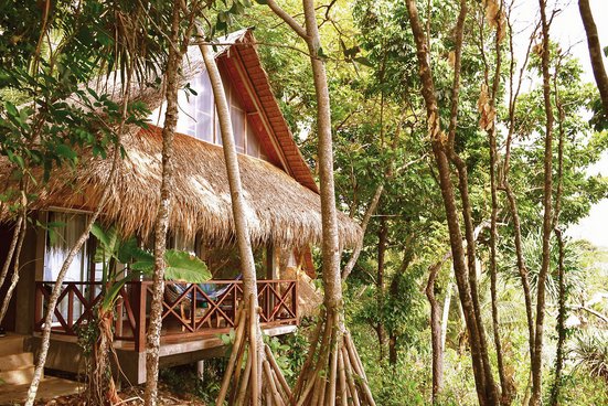 Traditionelle Bungalowanlage mit einzelnen, auf Pfählen stehenden Bungalows