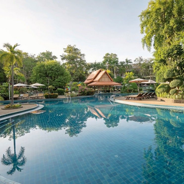 Palmen, Frangipani-Bäume und blühende Büsche: Der Name des Resorts ist Programm. Der lagunenartige Pool mit Whirlpools an den Rändern ist der ideale Ort, um die grüne Pracht zu genießen!