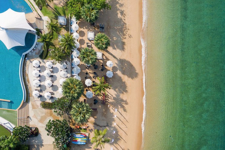 Jomtien: Weitläufiger Sandstrand mit Palmen und Pinienbäumen.