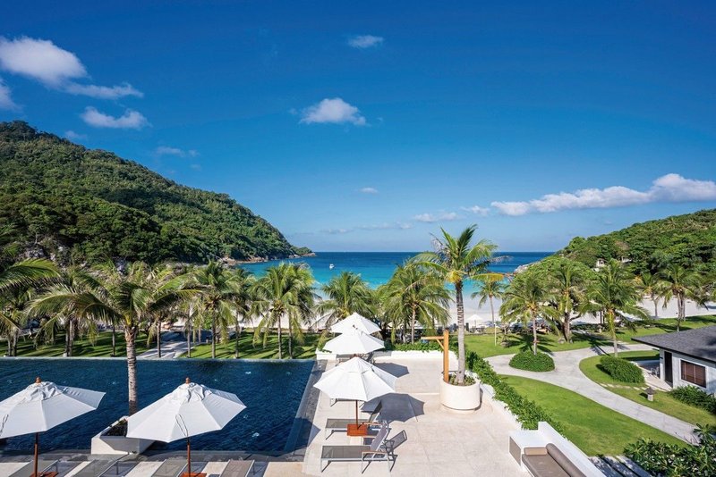 - 51-60 qm, Villa, Meerblick (zum Teil seitlich), kombinierter Wohn-/Schlafraum, Doppelbett (Kingsize), Dusche oder Badewanne, Regendusche, Außendusche, WC, Haartrockner, Klimaanlage, Minibar, Safe, TV (Flachbildschirm, Smart-TV), Espressomaschine, Terrasse (möbliert), Privatpool