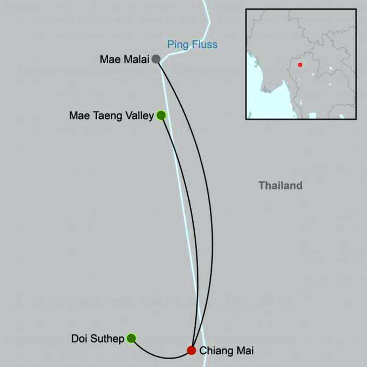 Chiang Mai: Entdecken Sie den berühmten Wat Phra That Doi Suthep, einen der wichtigsten Tempel Thailands, und geniessen Sie den atemberaubenden Blick auf die Stadt und die umliegenden Berge. Schlendern Sie durch die Altstadt, die für ihre traditionellen Holzhäuser und charmanten Märkte bekannt ist.