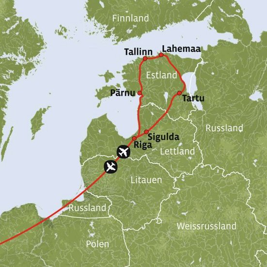 Flug nach Riga und Übernahme des Mietwagens am Flughafen. Zwei Übernachtungen in Lettlands Hauptstadt.