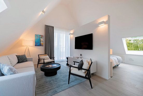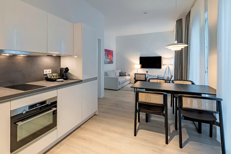 - 47-56 qm, Studio, Nebengebäude, optisch getrennter Wohn-/Schlafraum, (getrennt durch offene Wand), kombinierter Wohn-/Essraum, Sofabett, Dusche oder Badewanne, Bademantel, Badeslipper, Haartrockner, Kosmetikspiegel, Laminatboden, Klimaanlage, Korridor/Flur, Safe, TV (Sat-TV, Smart-TV), WLAN, Küche, Essecke, Gas-/E-Herd, Backofen, Geschirrspüler, Wasserkocher, Mikrowelle, Kaffeekapselmaschine, Kaffee/Tee, (Erstauffüllung), Kühlschrank, Endreinigung (kostenfrei), Zwischenreinigung (kostenfrei, 1 x wöchentlich)