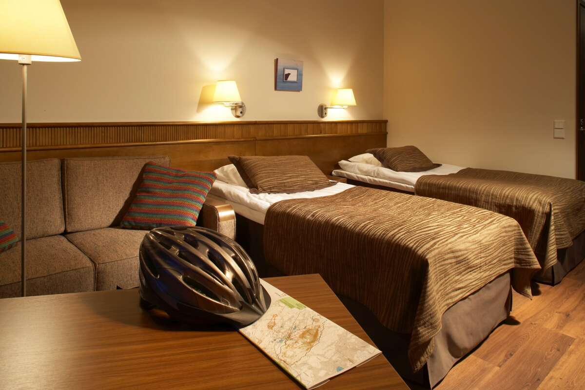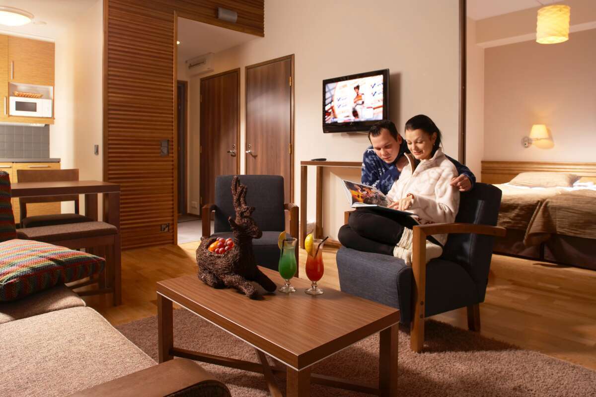 Die Fell-Suiten (Tunturi) eignen sich hervorragend für Familien mit Kindern. Sie verfügen über ein Schlafzimmer mit zwei Einzelbetten, Wohnzimmer mit Sofabett, eine kleine Küche und eine Sauna. Profitieren Sie von den Annehmlichkeiten eines Hotels, ohne dabei auf grosse Zimmer mit viel Platz und eigener Sauna verzichten zu müssen.