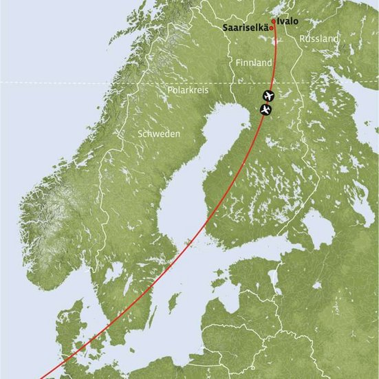 Flug nach Ivalo und Fahrt mit dem Flughafenbus (zahlbar vor Ort) nach Saariselkä zu Ihrem Blockhaus.