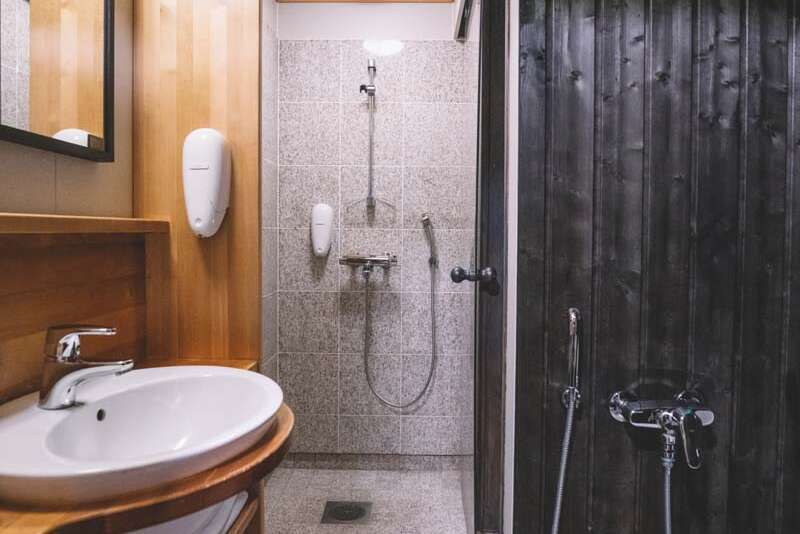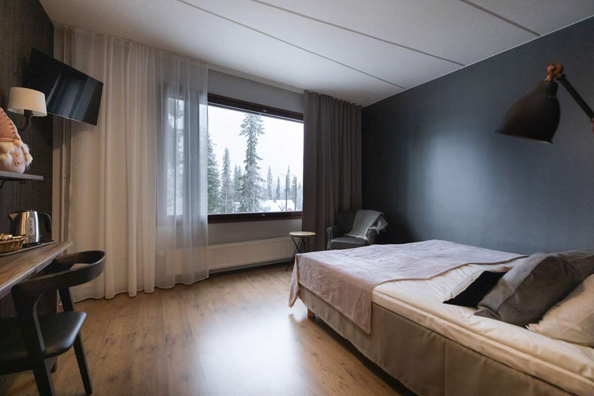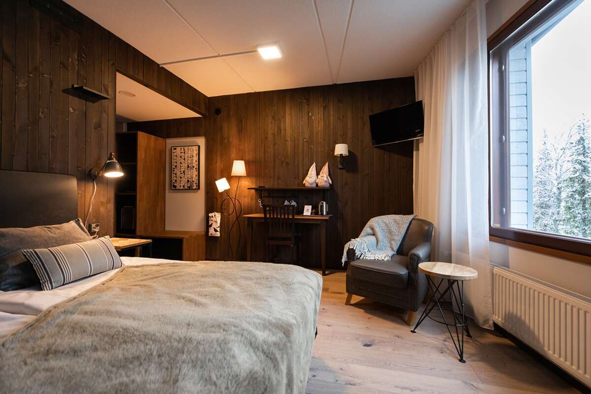 Die 30 gemütlichen Zimmer mit landestypischer Innenausstattung verfügen über zwei separate Betten, Dusche/WC, eigene Sauna, TV/Telefon und Internetzugang. Einmal pro Woche wird die Bettwäsche gewechselt. Einige Zimmer verfügen über einen Schwedenofen (gegen Aufpreis). Ausserdem hat das Hotel eine schöne Lobby-Bar mit offenem Kamin sowie ein feines Restaurant zu bieten, in welchem vor allem lokale Produkte angeboten werden.