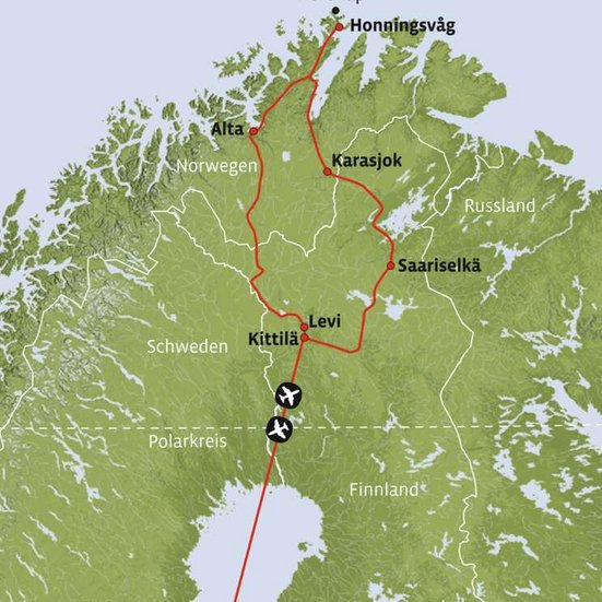 Sie fahren durch die dünn besiedelte Weite von Finnisch-Lappland Richtung Norden – hier leben mehr Rentiere als Menschen. Nach einer längeren Fahrt treffen Sie im norwegischen Alta ein.