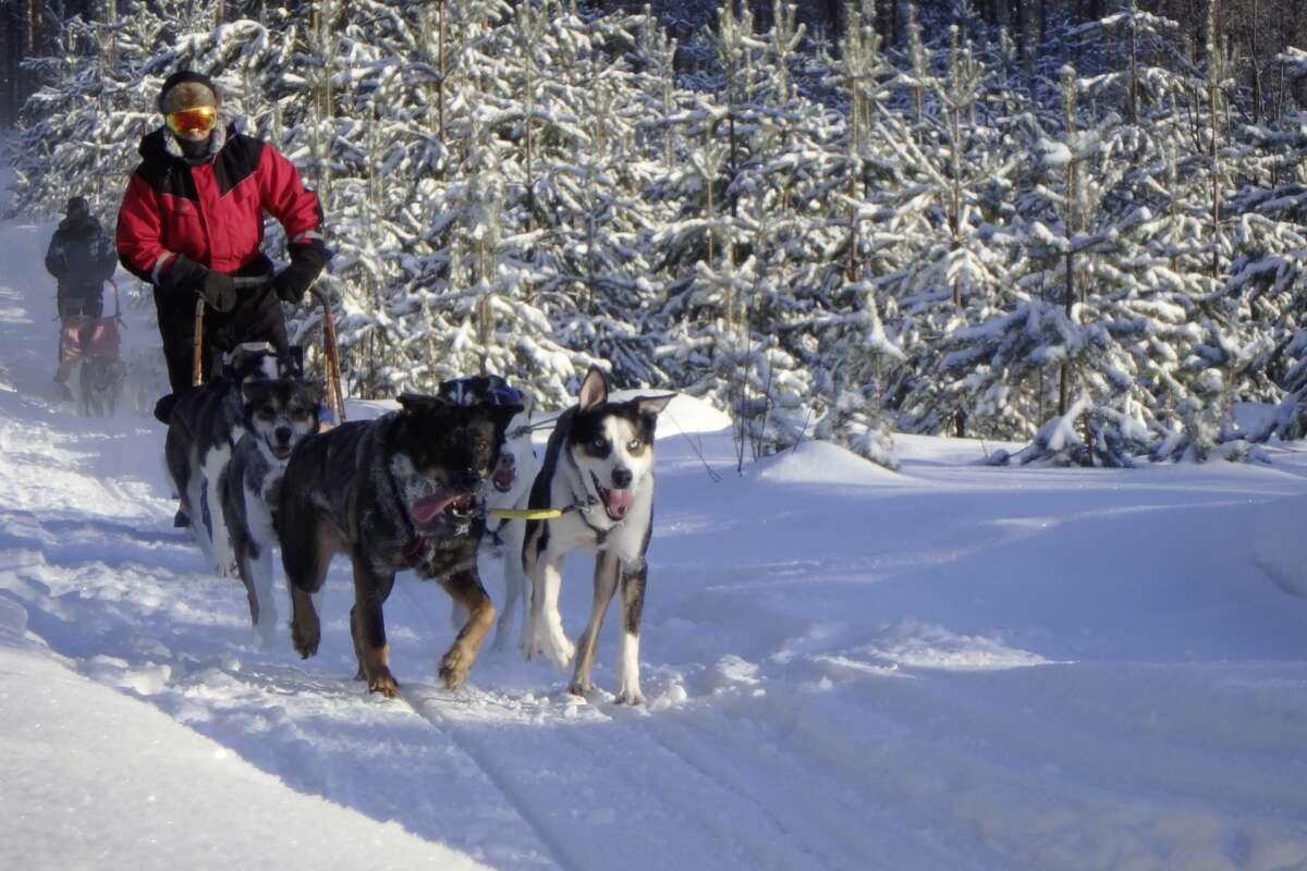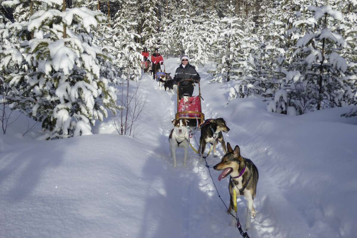 Heute geht es mit Ihrem Gespann bereits in anspruchsvolleres Terrain (ca. 2-2.5 Stunden). Die Hunde ziehen Ihren Schlitten durch tief verschneite Wälder und über zugefrorene Seen – Sie werden fasziniert sein und den Alltag vergessen.
