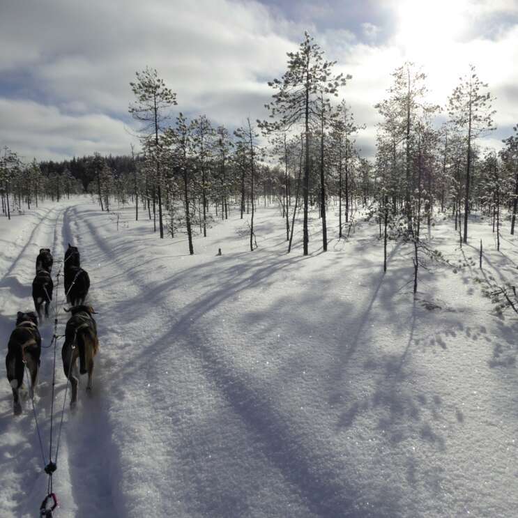 Bepacken der Schlitten und Aufbruch ins zauberhafte Nordkarelien. Auf dem Pfad fahren Sie über sanfte Hügel und weite Seen zur rustikalen Wildnishütte Aittokoski oder zum Ferienhaus Ruunaa, wo Sie übernachten. Am 5. Tag geht es nach dem morgendlichen Füttern von der Hütte aus zurück auf die Trails. Nach einer ca. 2–4-stündigen Schlittenfahrt erreichen Sie am Nachmittag die Lodge.