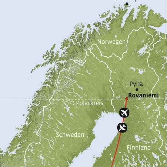 Direktflug nach Rovaniemi und Übernahme Ihres Mietwagens am Flughafen. Sie nehmen Fahrt auf Richtung Pyhä, wo Sie eine zauberhafte Ferienwoche erwartet.