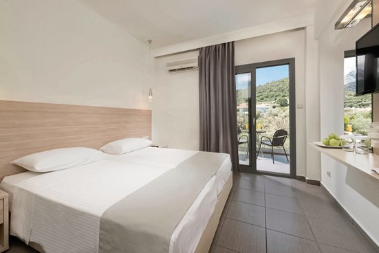 - 16-20 qm, Doppel, Hauptgebäude, Bettwäsche, Handtücher und Matratzen aus 100% Bio-Baumwolle, 1 Bad, Dusche, WC, Haartrockner, Klimaanlage, Safe, 1 TV (Sat-TV), Kühlschrank, Balkon oder Terrasse