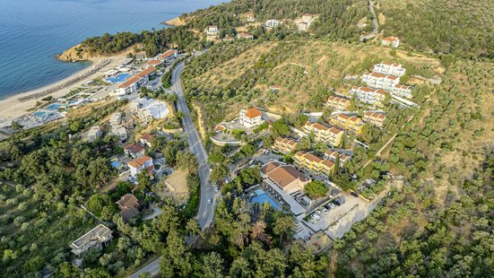 - Sand-/Kieselstrand: flach abfallend, von der Anlage getrennt durch Straße, Sonnenschirme (kostenpflichtig), Liegen (kostenpflichtig)