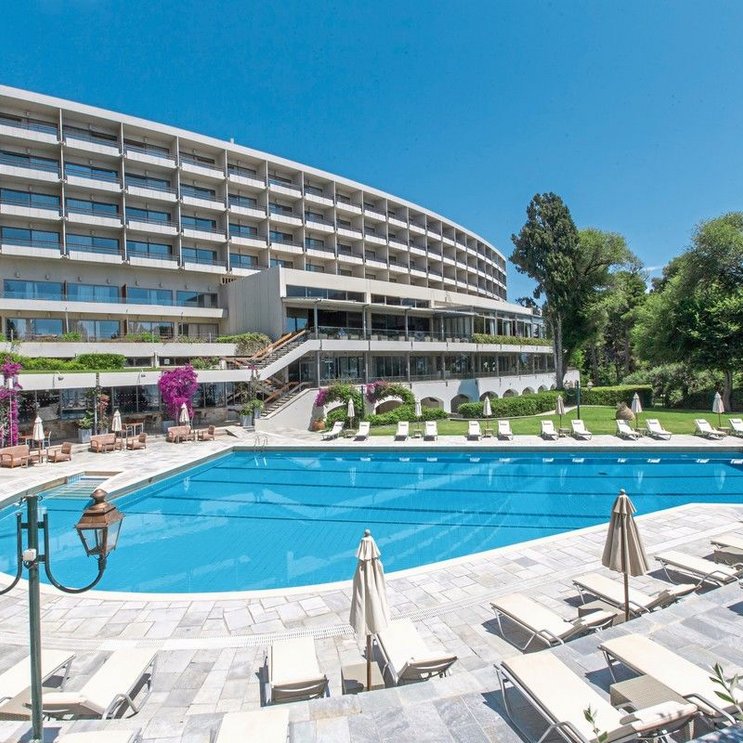 Außenpool direkt am Strand - mit wundervollem Panorama und Sonnenuntergängen zum Verlieben. Das Hotel Corfu Holiday Palace in Kanoni lockt mit hoteleigenen Restaurants internationalen Spezialitäten.