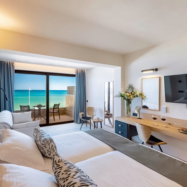 - 26-30 qm, Doppel, Superior, Meerblick, 1 Bad, Dusche, WC, Haartrockner, Klimaanlage, individuell regulierbar, Safe, 1 TV (Sat-TV), Kühlschrank, Balkon oder Terrasse (möbliert)