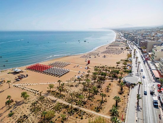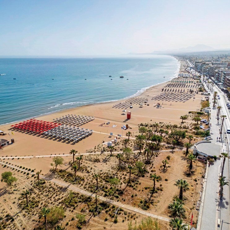 - Sandstrand: öffentlich, ca. 7 km lang, Sonnenschirme (kostenpflichtig), Liegen (kostenpflichtig), Kosten belaufen sich auf einen Mindestverzehr von ca. 6 Euro