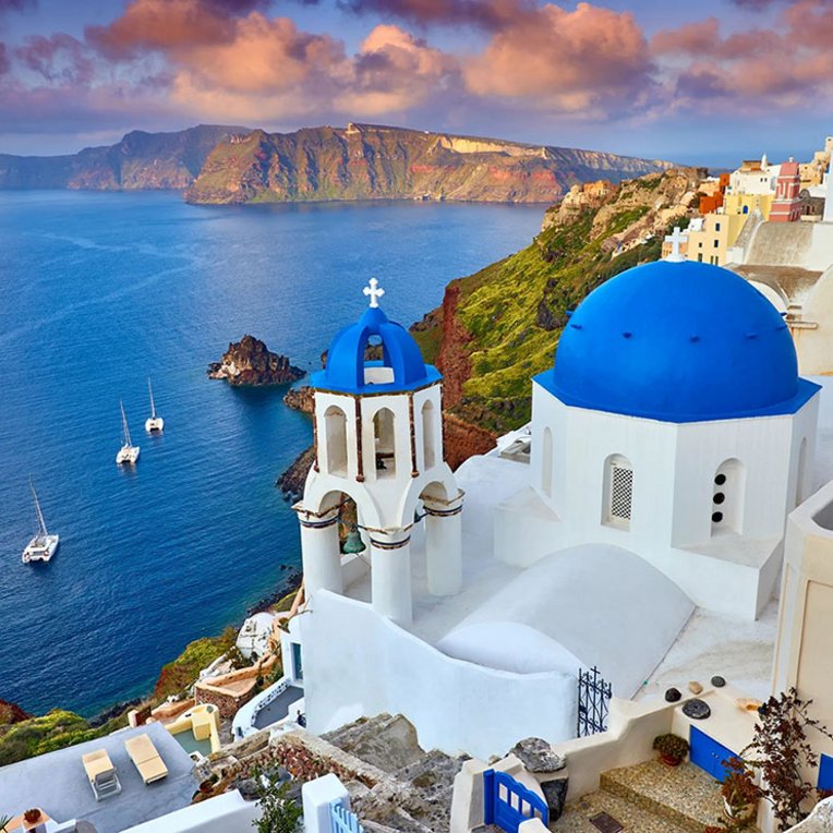 An der Ostküste ziehen sich sanft abfallende, fruchtbare Ebenen bis an die schwarzen Strände der Insel hin. Im Westen, hoch oben am Rand der Kraterwand, legen sich malerische Dörfer, etwa Imerovigli oder Oia, wie weisse Bänder an den Fels. Die Häuser sind auf inseltypische Art in den Fels gehauen, weissgetüncht und mit Treppen verbunden. Würdevoll thront das Wahrzeichen Santorinis, die Kirche Agíos Minás, mit ihren weissen Mauern und leuchtend blauen Kuppeln über dem Meer.