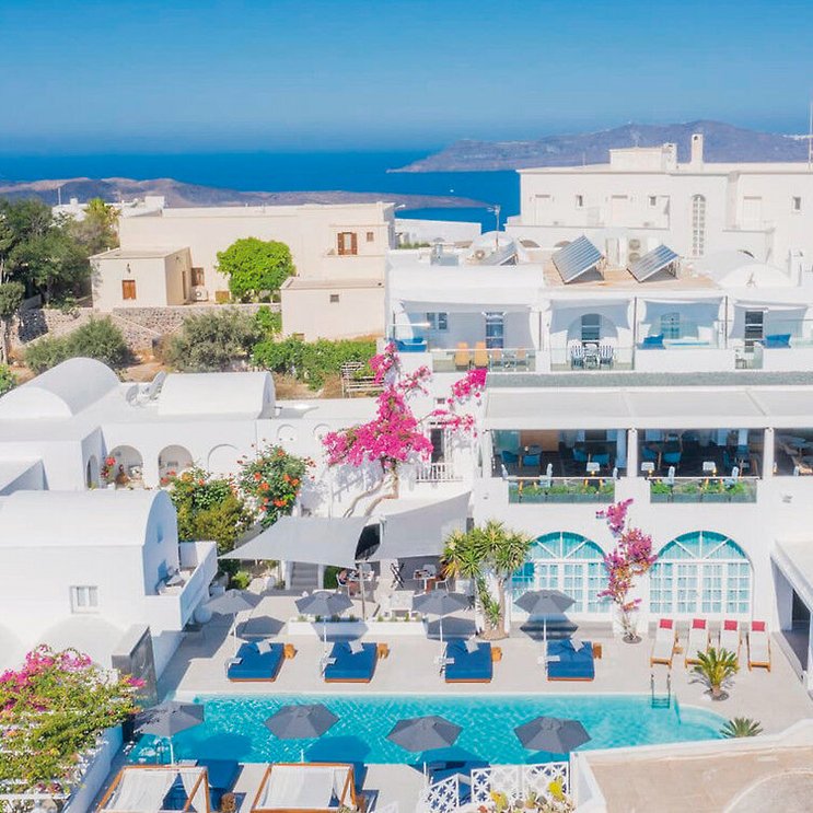 Mit ihrem strahlenden Weiß fügt sich die stilvolle Anlage harmonisch in das gewachsene Stadtbild ein. Innen verbeugt sich das Design vor der Natur Santorins und schafft einen modernen und stylischen Rückzugsort für Genießer.