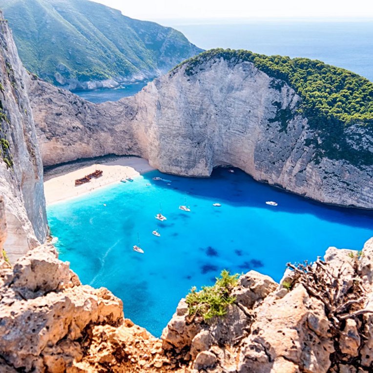 Shipwreck Coast: Auf zur Navagio-Bucht mit dem berühmten, alten Schiffswrack. Der Strand ist ein Traum: bizarre Felsformationen, feinster Sand, kristallklares Wasser.