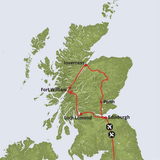 Flug nach Edinburgh und Mietwagenübernahme. Fahrt nach Perth, zwei Übernachtungen in der Region.
