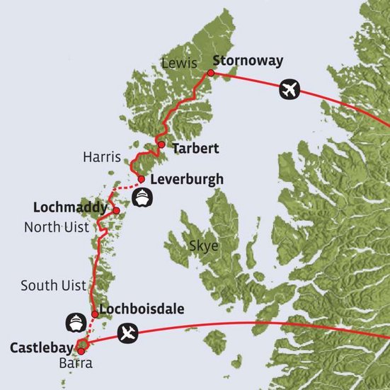 Flug von Glasgow nach Barra, dem einzigartigen Gezeitenflughafen. Mietwagenübernahme und Fahrt zur ersten Unterkunft. Zwei Übernachtungen auf Barra.