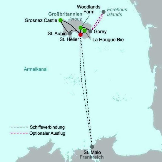 (Di) Der Nordwesten Frankreichs liegt so nah. Das werden Sie heute bei einem Tagesausflug in die Hafenstadt Saint-Malo in der Bretagne erleben. Bummeln Sie durch die schönen Gassen, die hinter den mächtigen Stadtmauern versteckt liegen. Empfehlenswert ist ein Spaziergang auf den wehrhaften Mauern, so hat man zur einen Seite einen atemberaubenden Blick auf das Meer und zur anderen in die charismatische Altstadt. Am Abend Rückkehr nach Jersey. (F, A)