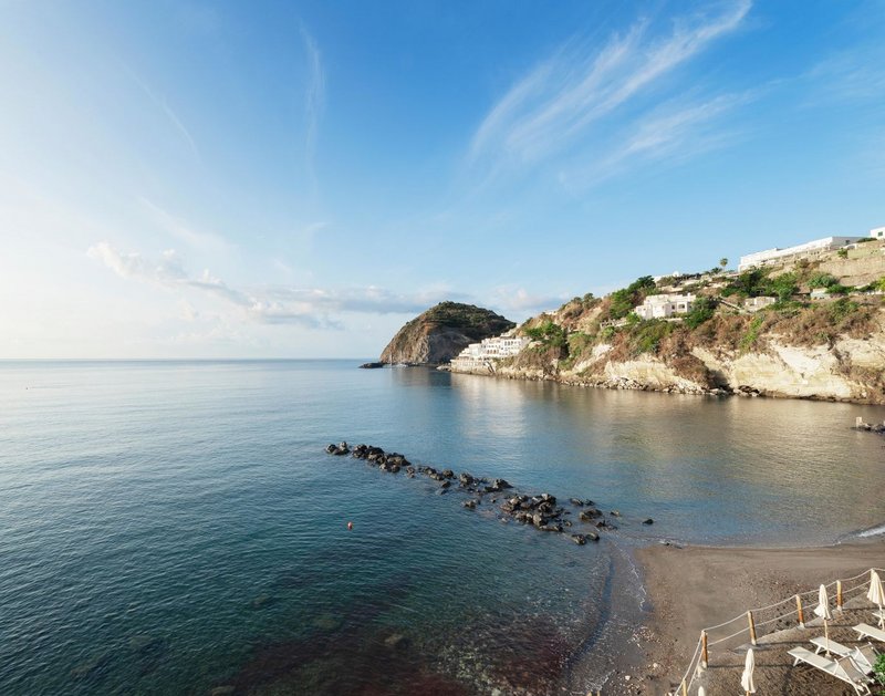 Wer in diesem Hotel Urlaub macht, der verbringt die Zeit in einer malerischen Gartenanlage: den berühmten Thermalgärten Apollon. Sie genießen die wunderbare Aussicht auf die Bucht Sant' Angelo.